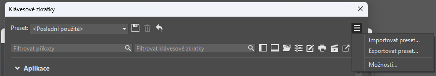 Možnosti [Ctrl+M] – Všeobecné – Klávesové zkratky - Exportovat preset / Importovat preset v Zoner Studiu Beta