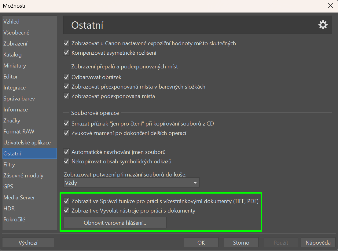 V dialogu Možnosti | Ostatní zaškrtněte volbu Zobrazit ve Správci funkce pro práci s vícestránkovými dokumenty (TIFF, PDF) a změny uložte. Po aktivování této volby se vám nabídka pravého panelu v modulu Správce rozšíří o sekci Vícestránkové dokumenty.